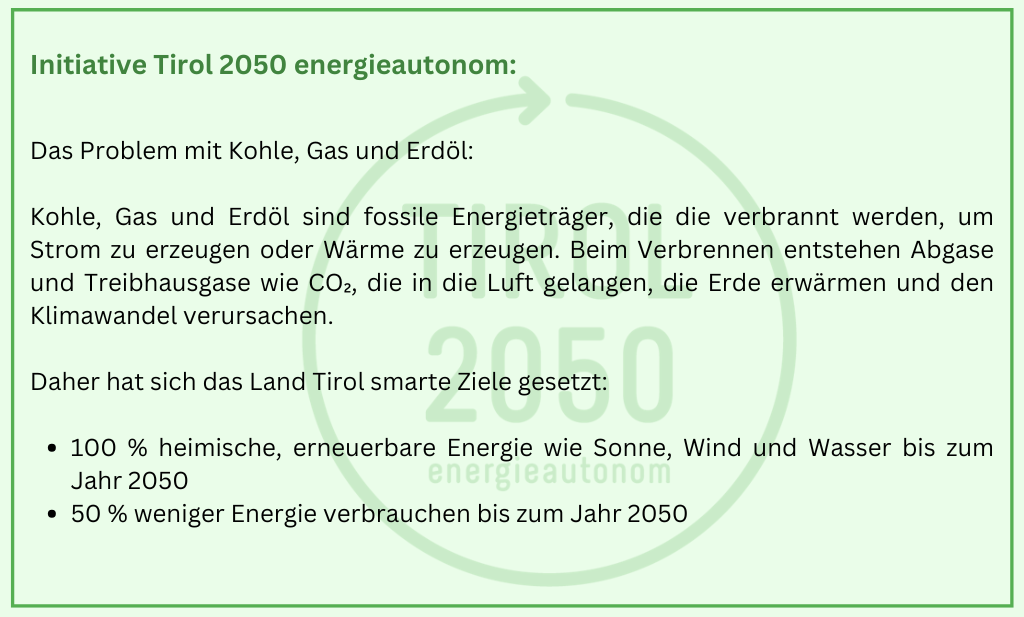 Strom kann auf viele verschiedene Arten erzeugt werden: durch das Verbrennen von Kohle, Gas und Erdöl, in Atomkraftwerken oder aus erneuerbaren Quellen wie Sonne, Wind und Wasser. In Tirol spielt besonders die Wasserkraft eine große Rolle. Die vielen Berge und Flüsse sind ideal, um aus fließendem Wasser Strom zu erzeugen.
