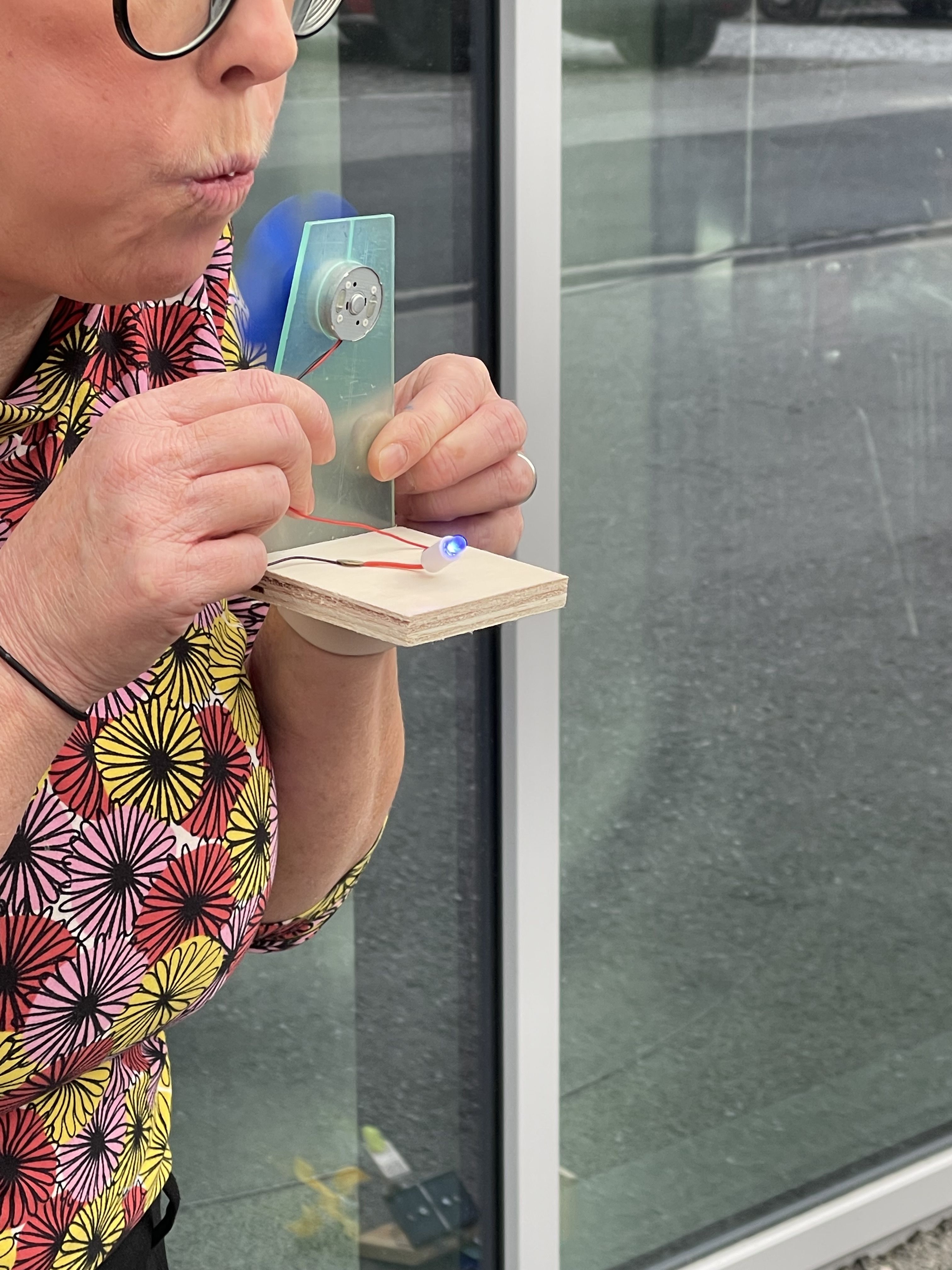 Auch mit Windenergie kann Strom erzeugt werden. Die Kinder bringen die Lampe zum Leuchten. Dafür muss aber ordentlich gepustet werden.