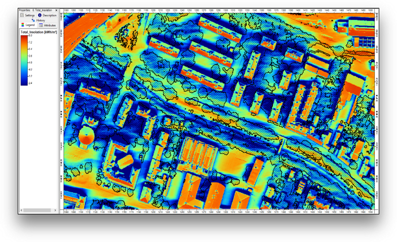 Dank der genauen Oberflächenmodelle aus Laserscanning-Daten kann das Solarpotential von Dächern genau berechnet werden. Mit digitalen 3D-Modellen und Einstrahlungskarten lässt sich feststellen, wo sich Photovoltaik oder Solarthermie lohnt.