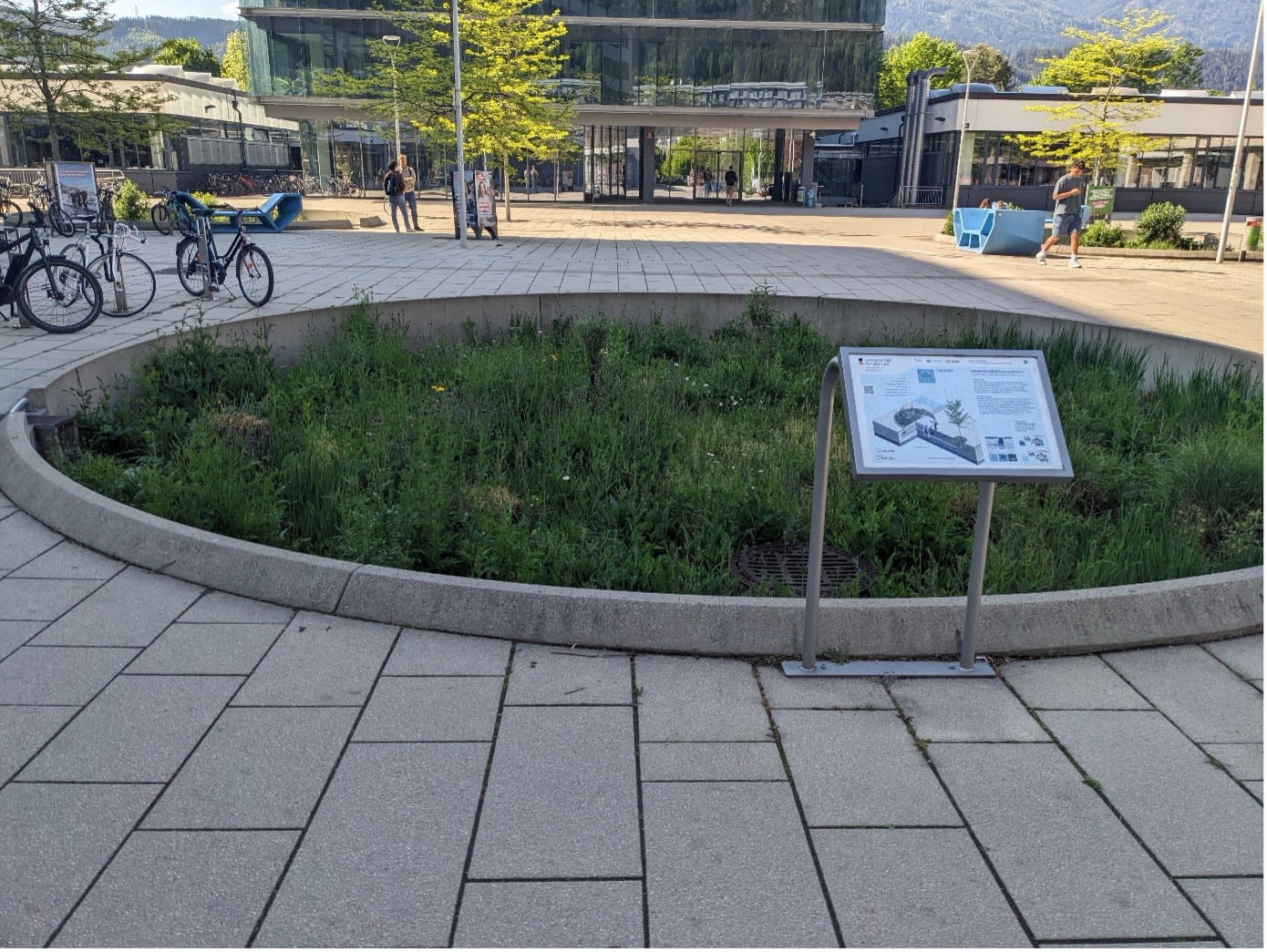 Regengärten können helfen, zum Beispiel direkt am Uni-Vorplatz. Dort kann Regenwasser versickern, statt in die Kanalisation zu fließen.