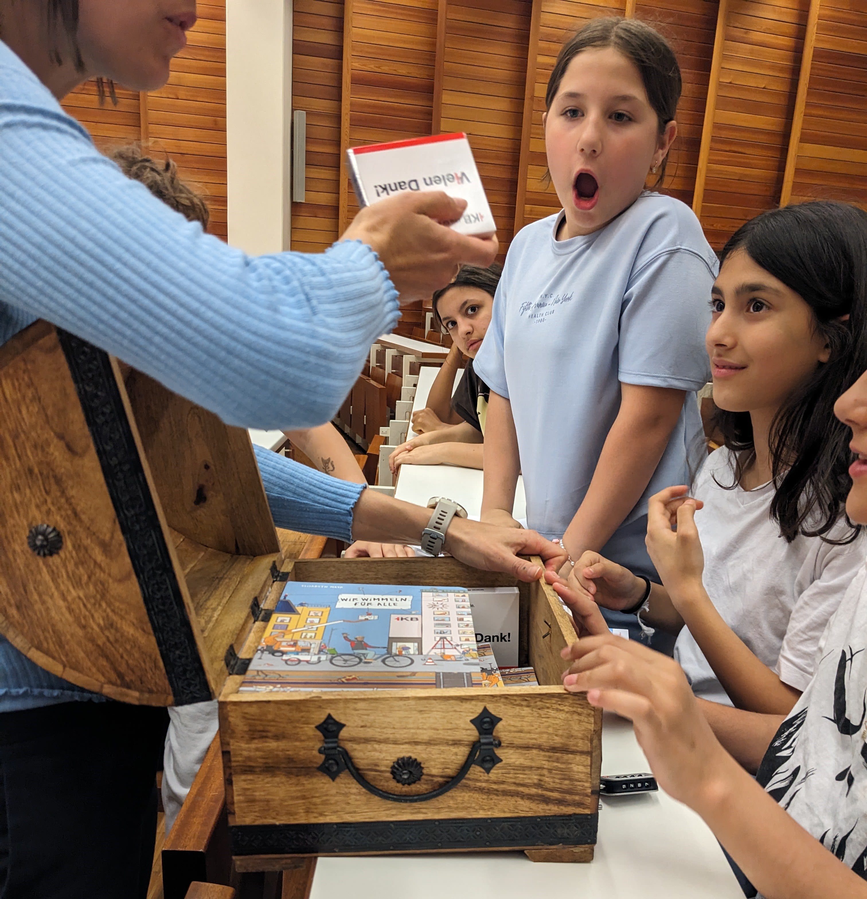 Alle Schülerinnen und Schüler waren mit Begeisterung beim Programm dabei. Gemeinsam finden sie die Zahlenkombination zum Öffnen der Schatztruhe. Viel Spaß mit den Wimmelbüchern der IKB!