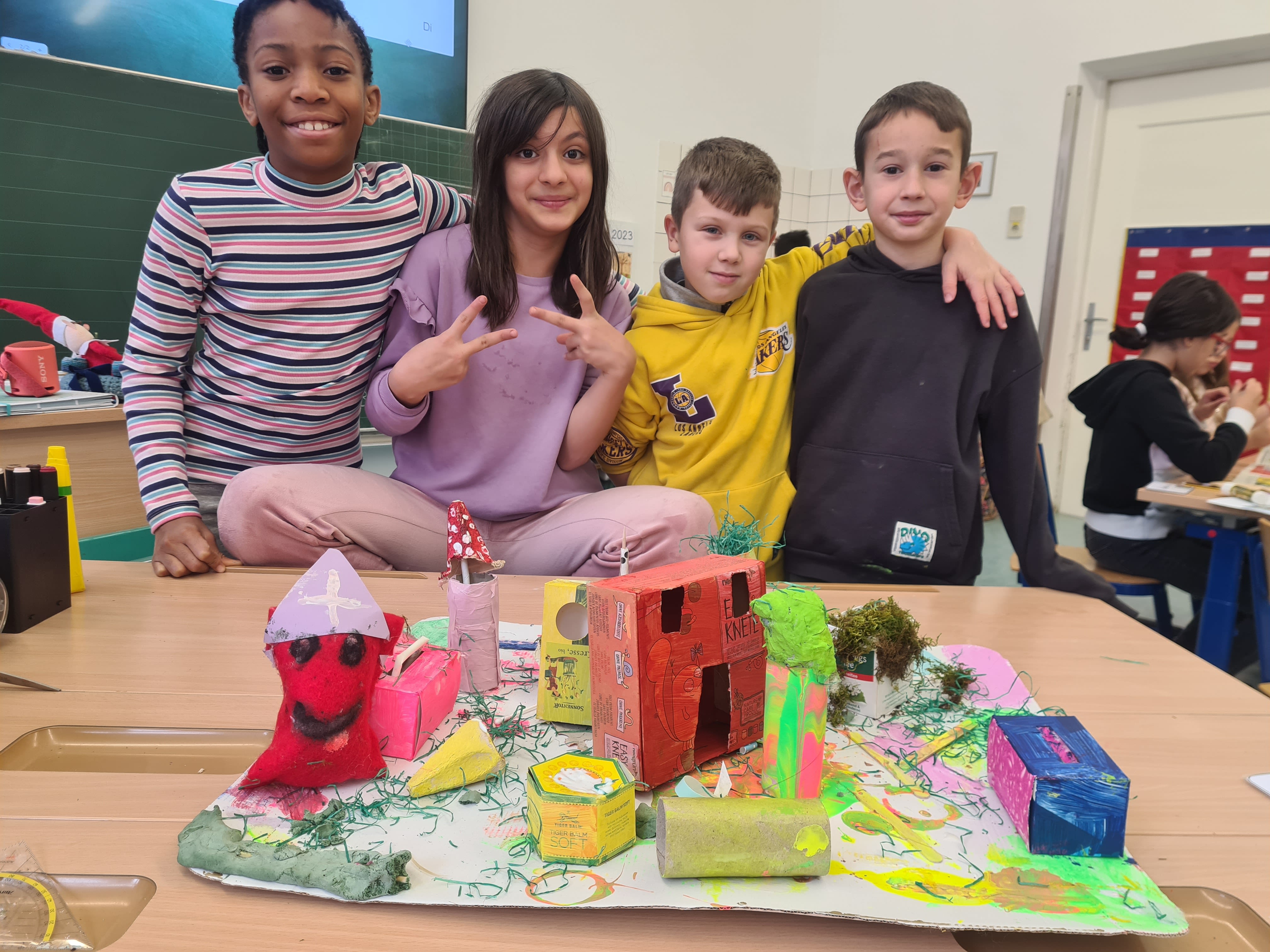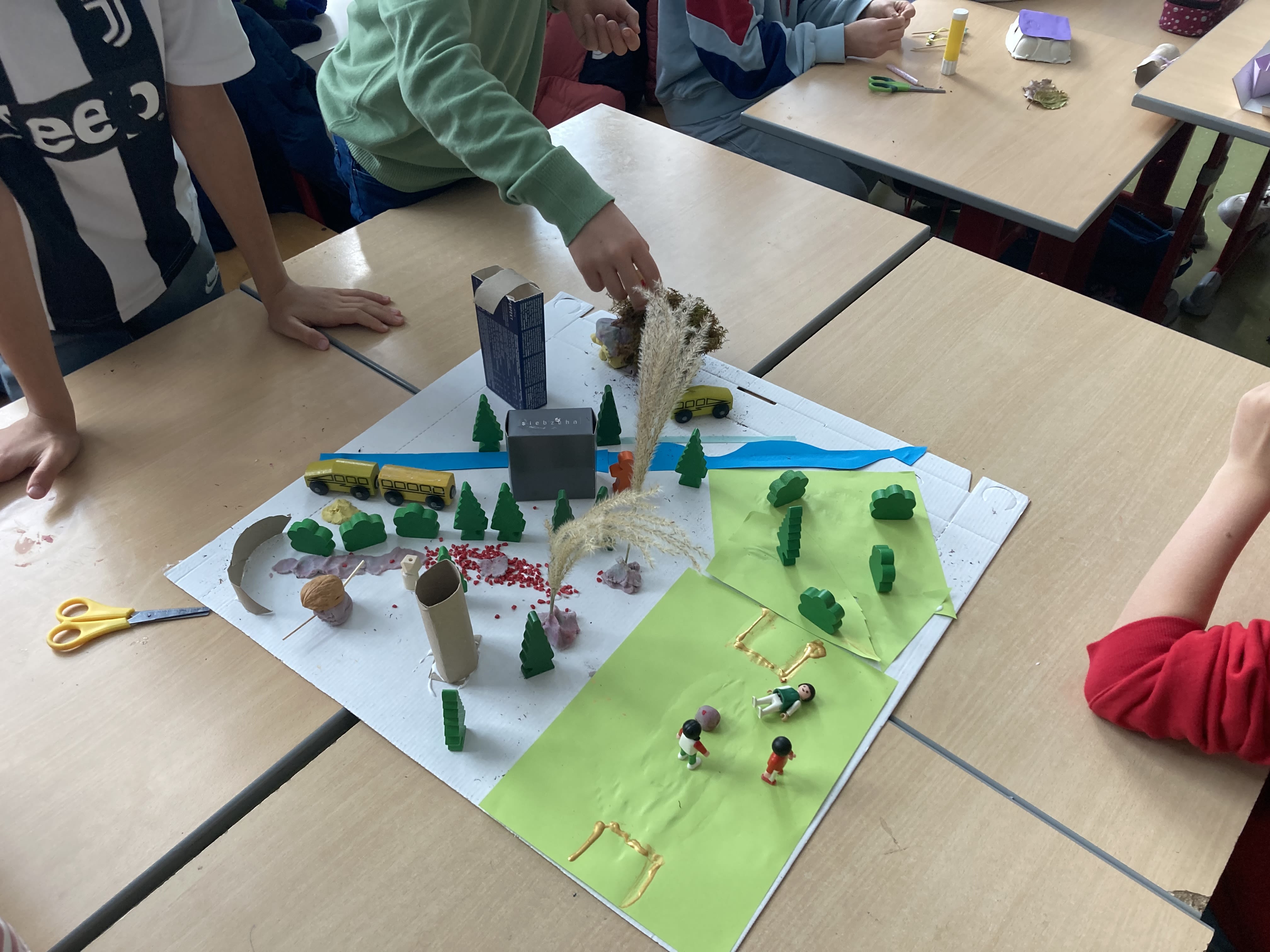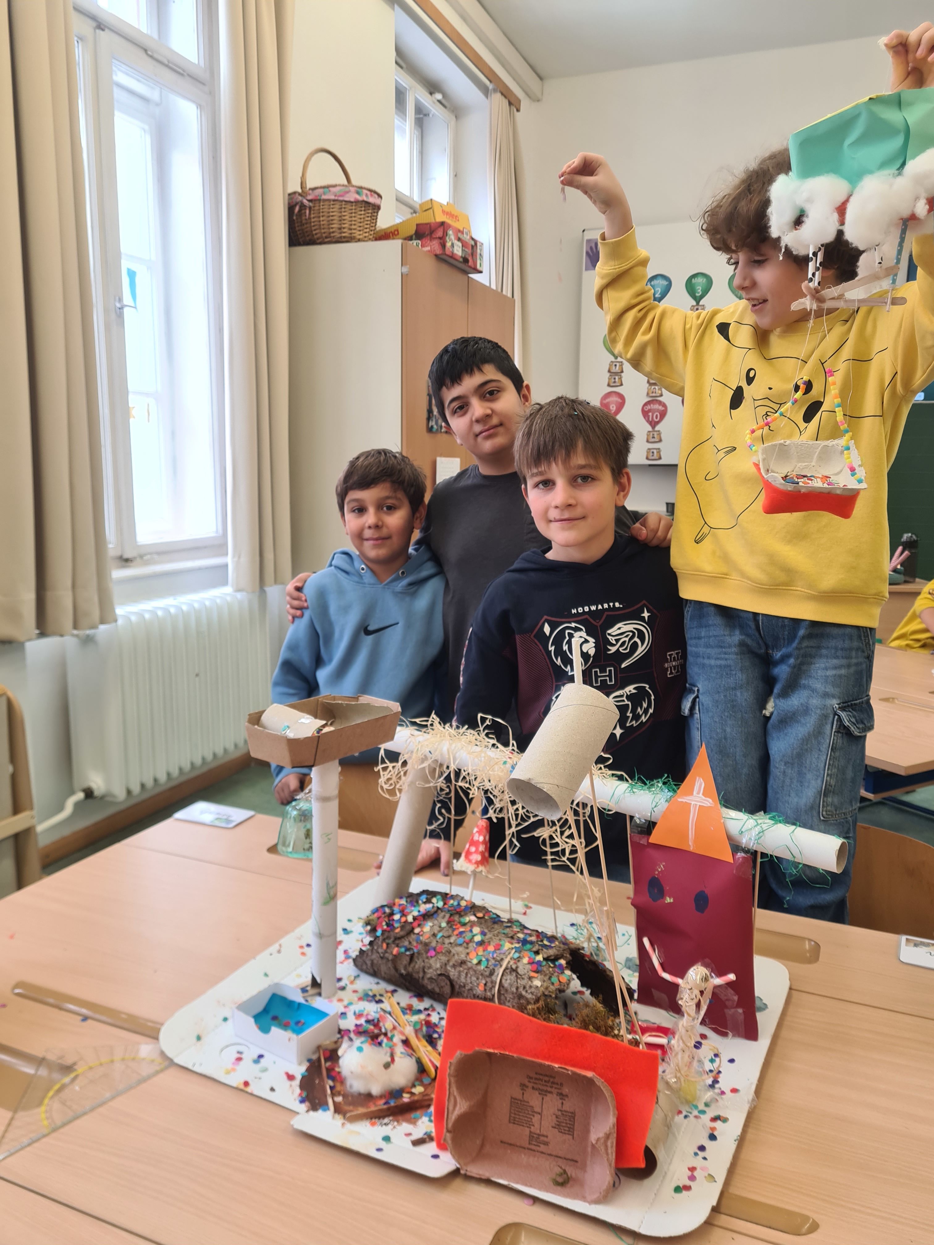 Im Kleingruppen haben die Kinder gemeinsam entschieden, wie sie ihren Prototypen gestalten wollen. Für die Prototypen haben wir verschiedene Bastel- und Naturmaterialien bereitgestellt, die wir über Wochen gesammelt haben. Der Kreativität der Kinder waren keine Grenzen gesetzt. Es war wirklich inspirierend zu sehen, mit welcher Begeisterung sie sich dieser Aufgabe gewidmet haben. Für die meisten Gruppen reichte eine Stunde nicht aus, sie durften ihre Prototypen in einer anderen Schulstunde mit ihren Klassenlehrer:innen fertig machen.